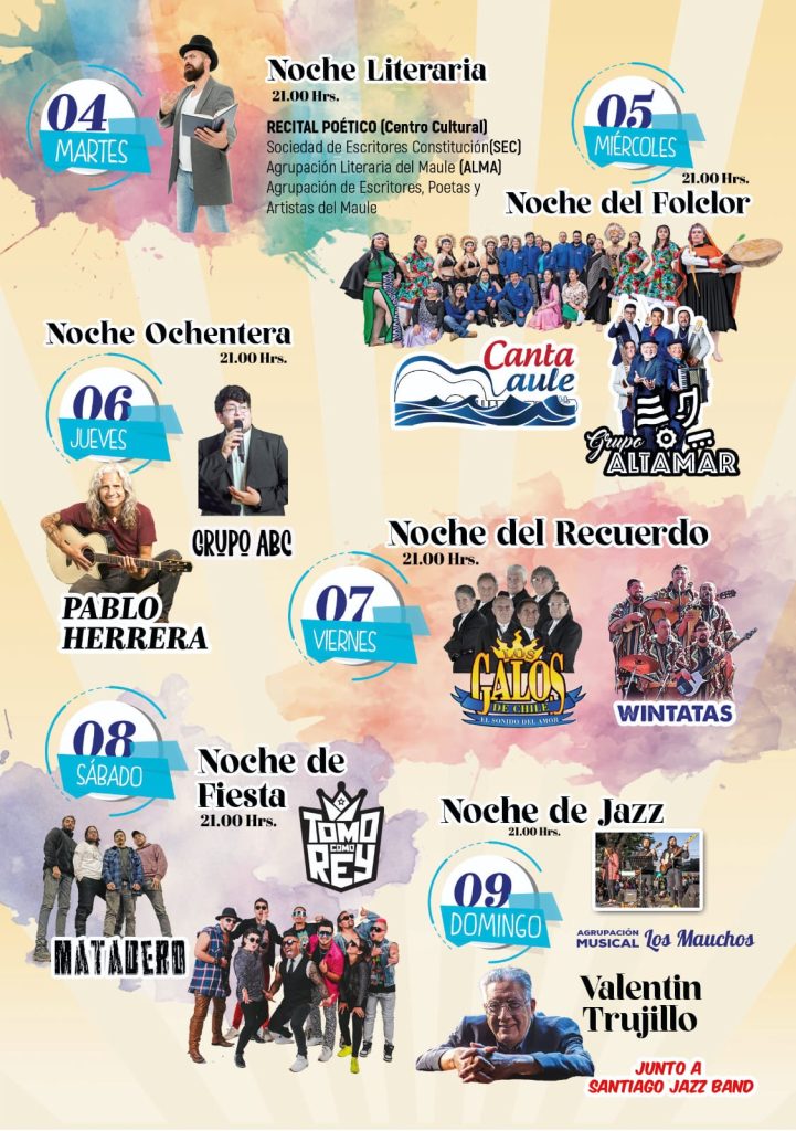 - Martes 04: Declamación de poemas a manos de las 3 agrupaciones literarias de nuestra ciudad, Sociedad de Escritores de Constitución, ALMA (Artes y letras del Maule) y Agrupación de Escritores, poetas y compositores del Maule. Lugar: Salón Jorge Müller, Centro Cultural Municipal, a las 20.00 horas.
